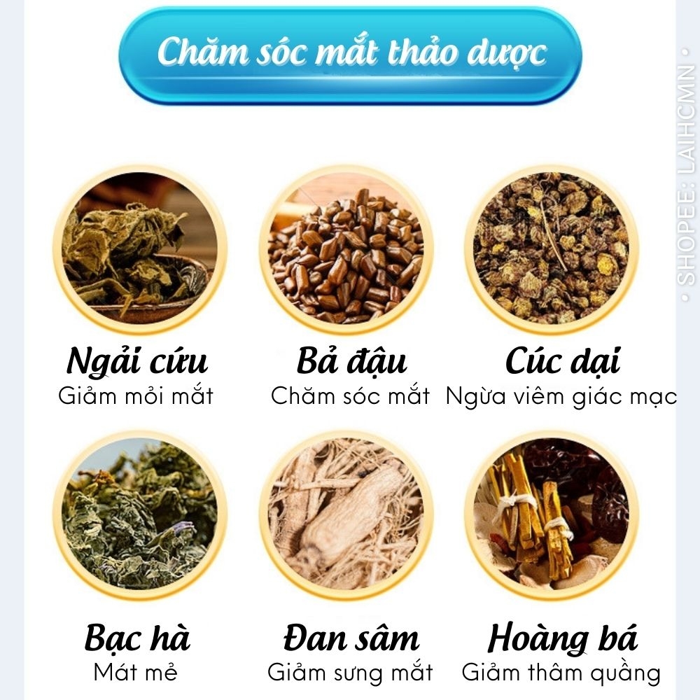 - Chiết xuất từ các thành phần tự nhiên: Lá ngải cứu, quả việt quất, Senecio, hoa cúc dại, bạc hà, hạt quế và cây bần. Thích hợp cho người gặp các vấn đề về mắt: bị cận thị, khô, ngứa, chảy nước mắt và mờ mắt.