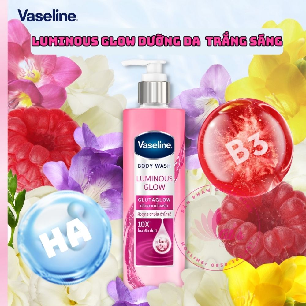 Sữa tắm Vaseline Body Wash Luminous Glow GlutaGlow 10X (Hồng) lại nổi bật hơn hẳn với khả năng dưỡng ẩm và dưỡng trắng bật tone. Một thành phần nổi bật trong sản phẩm này là Hyaluronic Acid - thành phần dưỡng ẩm da trong mọi loại mỹ phẩm. HA có khả năng liên kết với 1000 phân tử nước, tạo lớp bảo vệ giúp da đàn hồi, căng mịn tràn đầy sức sống. Kết hợp với Glutathione, công dụng dưỡng trắng của sữa tắm Vaseline hồng càng được tăng cường hơn nữa.