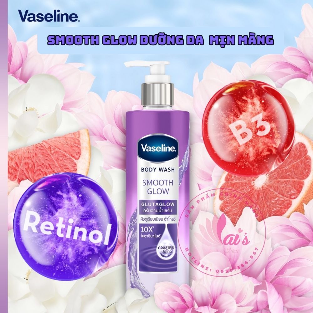 Sữa tắm Vaseline Body Wash Smooth Glow GlutaGlow (Tím) có chứa Collagen Peptide - thành phần tạo nên kết cấu đàn hồi, mịn màng của làn da. Là một dạng Collagen thủy phân, thành phần này giúp giữ các phân tử nước trên da, lấp đầy các khoảng trống giữa các tế bào. Từ đó, làn da luôn ẩm mịn và mềm mại, không còn cảm giác khô, sần mỗi khi chạm vào nữa. Với hương hoa mộc lan đặc trưng, không nồng, không hắc, sản phẩm dễ dàng đốn tim bất cứ ai được thưởng thức mùi hương này một lần.