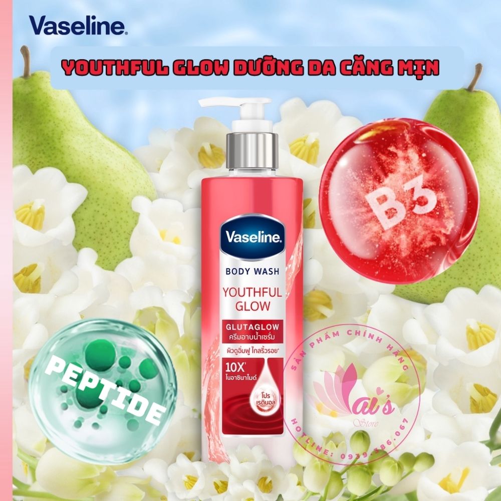 Sữa tắm Vaseline Body Wash Youthful Glow GlutaGlow 10X (Đỏ) được bổ sung với công thức đặc biệt bởi thành phần Pro-Retinol. Đây là một thành phần cực kỳ quý cho làn da nếu như chị em muốn trẻ hóa da. Pro-Retinol khi thẩm thấu vào làn da sẽ là chất xúc tác giúp tăng cường khả năng sản xuất Collagen và Elastin tự thân, giúp da săn chắc và đàn hồi hơn. Bên cạnh đó, Pro-Retinol sẽ dần xóa mờ các nếp nhăn, thâm nám và mụn trên da để giúp làn da không những trẻ mà còn khỏe. Dầu hoa hướng dương trong sản phẩm cũng làm tăng hiệu quả chống oxy hóa cho làn da. Bởi dầu hoa hướng dương chứa hàm lượng vitamin E và vitamin C lớn - hai hoạt chất trẻ hóa làn da.
